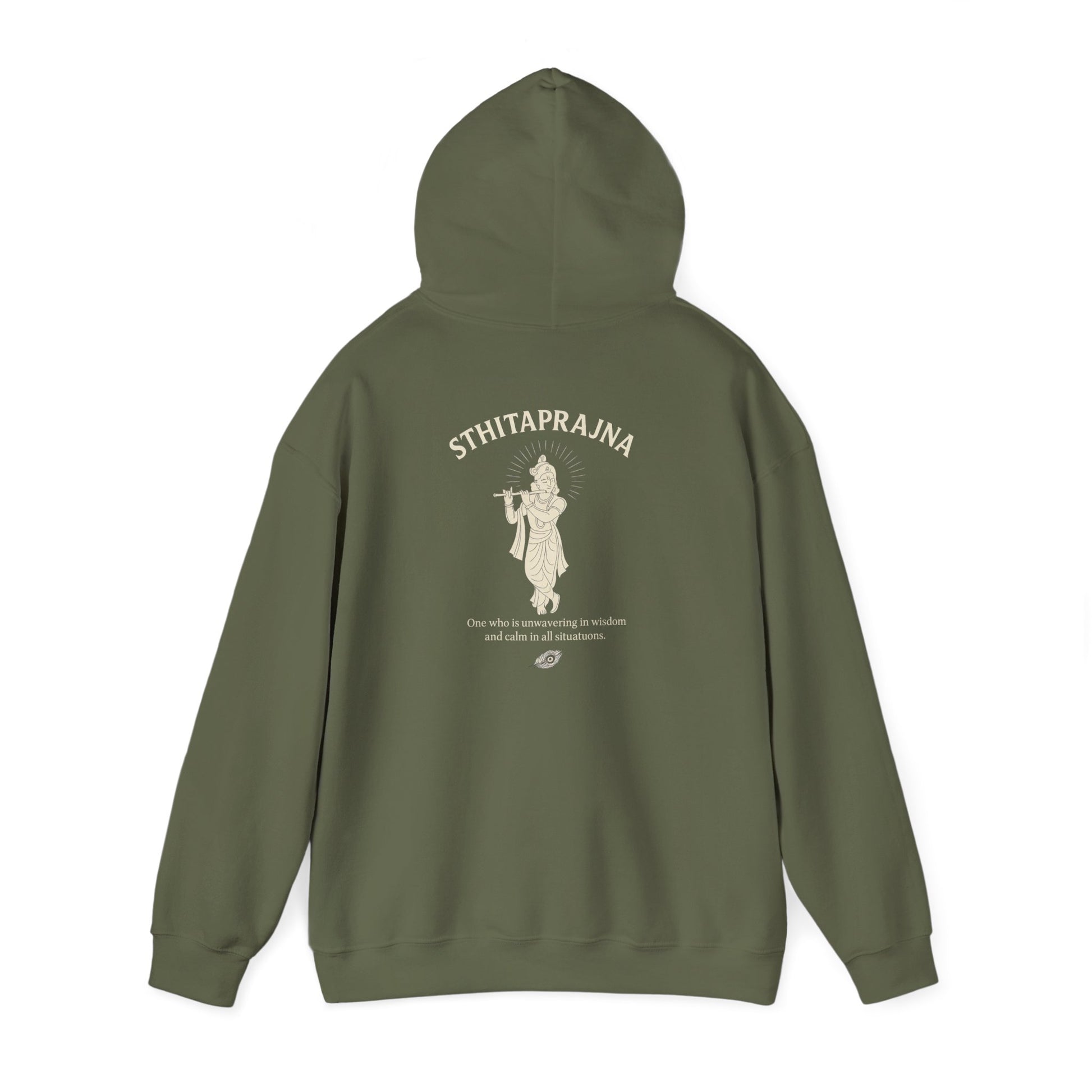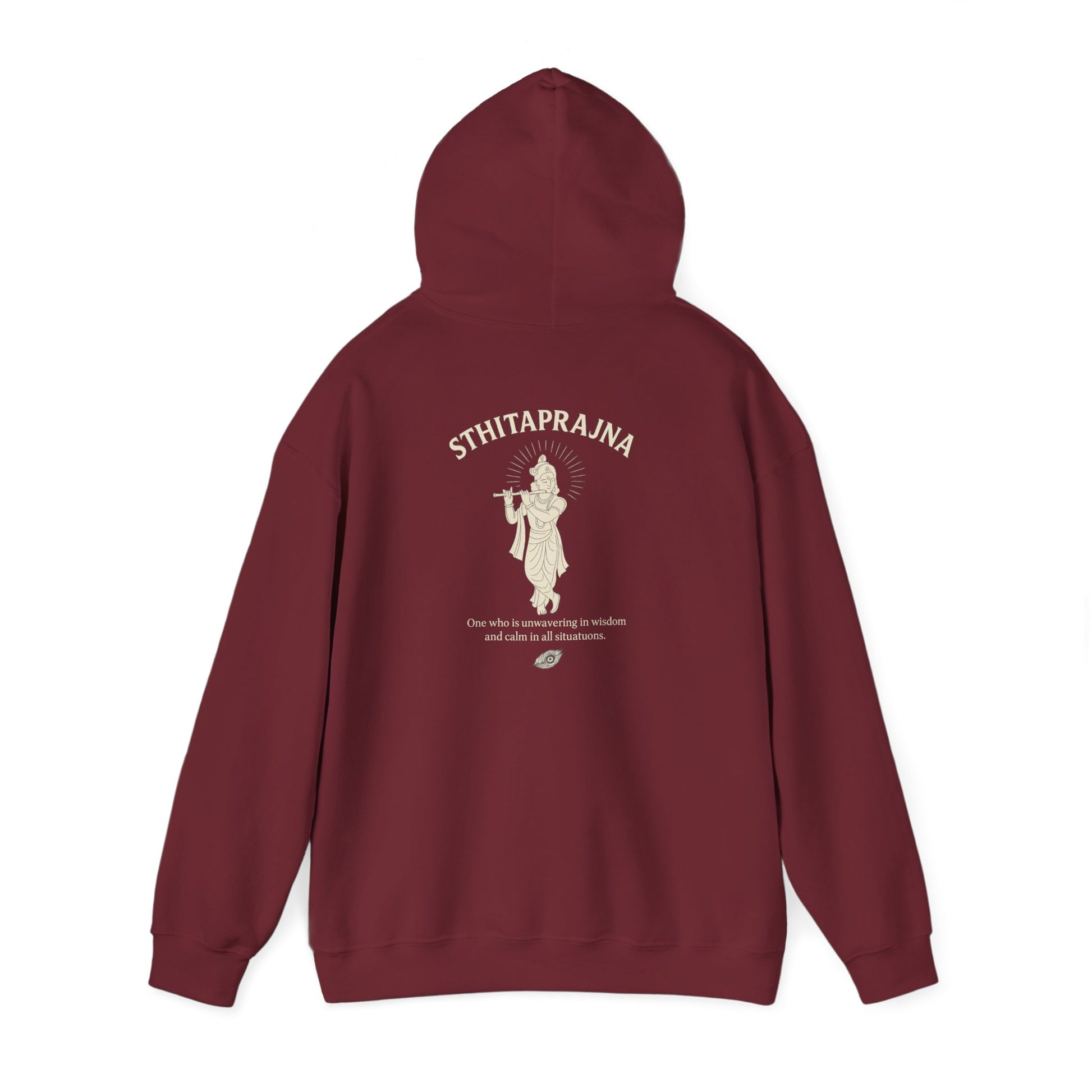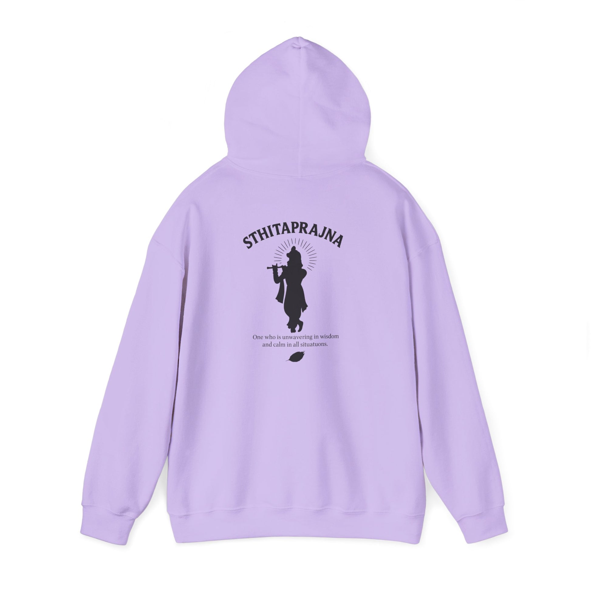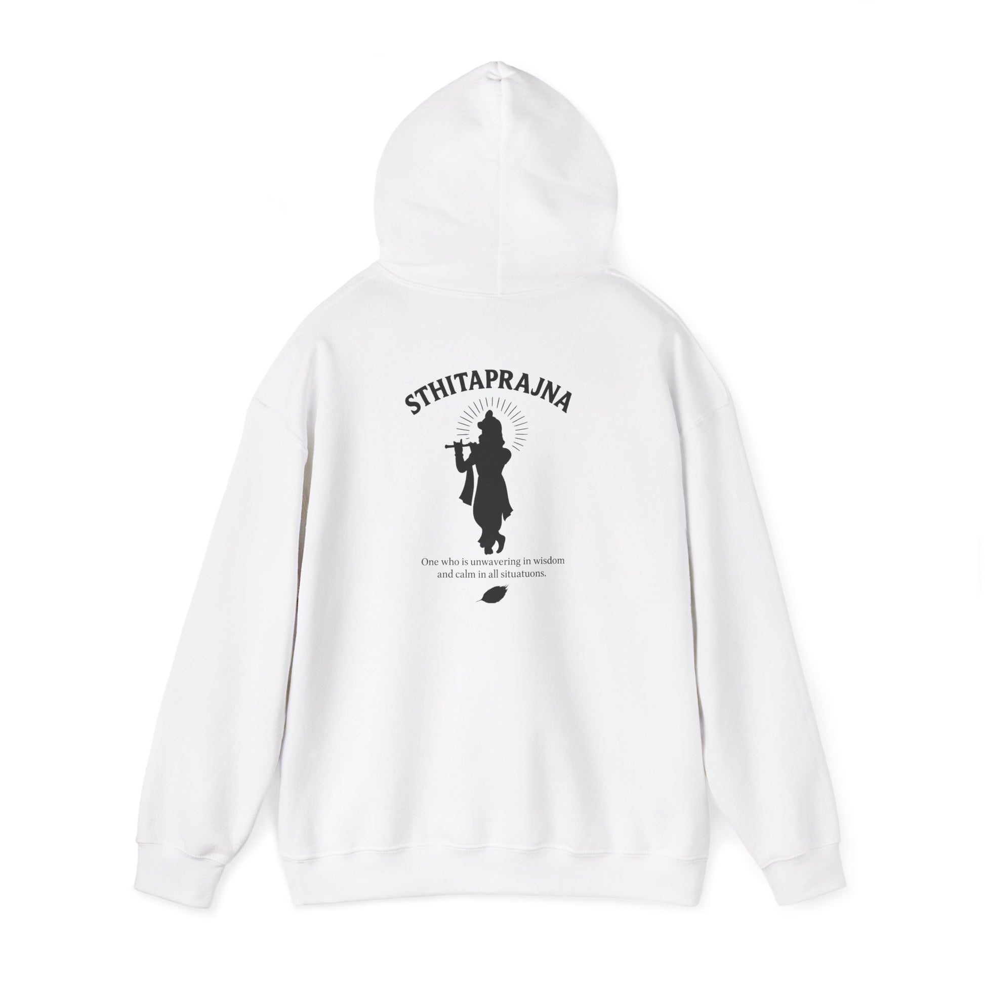This hoodie captures the essence of the Sthitaprajna not just as a concept—but as a presence. On the back, Lord Krishna is shown in minimalist silhouette, standing cross-legged and playing the flute. His form is serene, his stance unshaken. Below the artwork, the message flows softly: