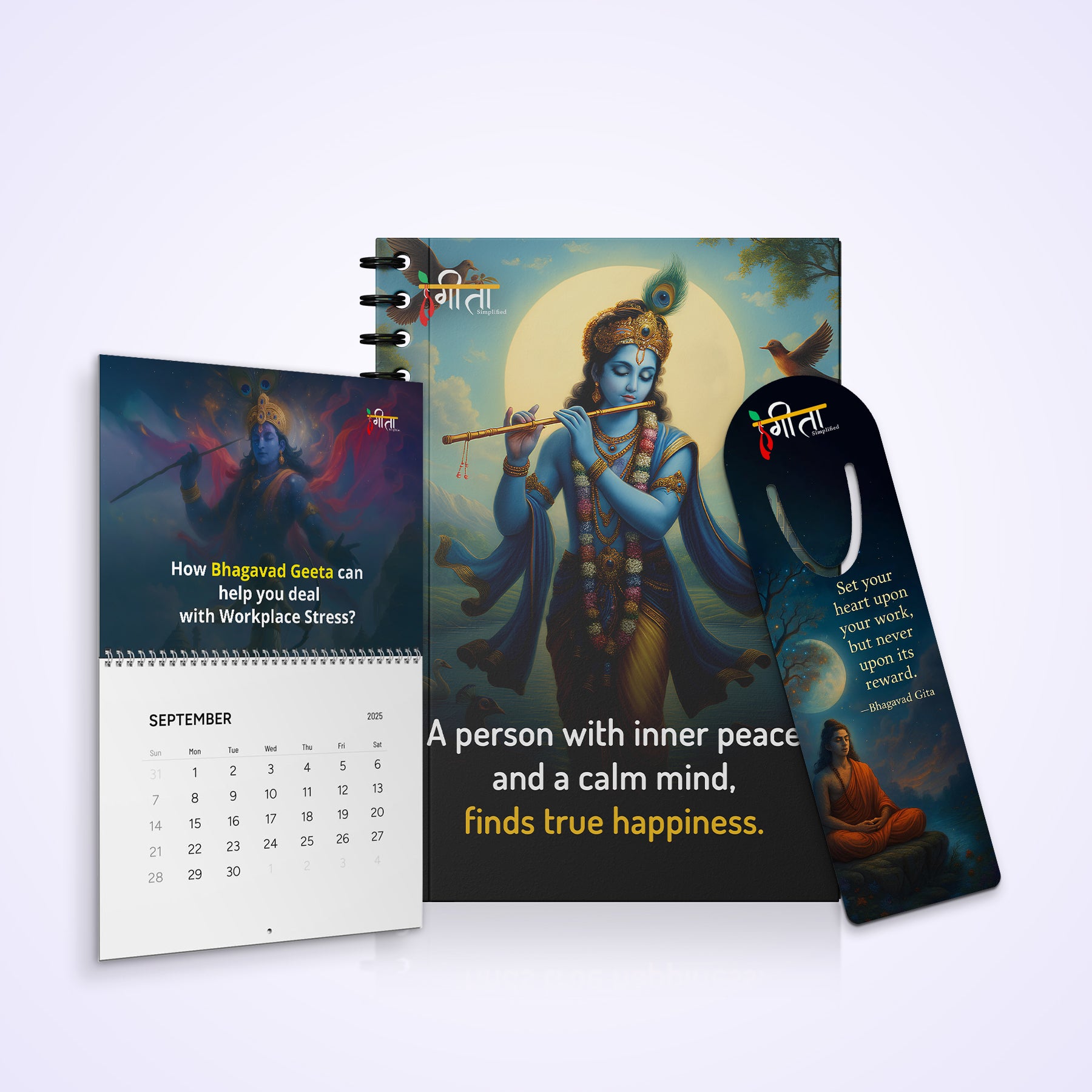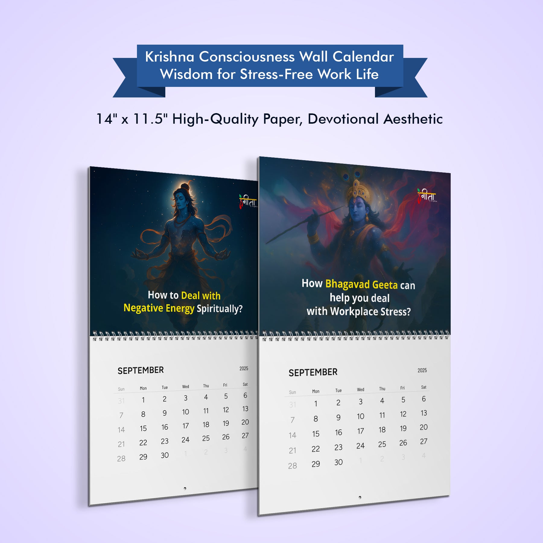 Premium 14" x 11.5" glossy calendar with large-format Krishna art. Each month pairs visuals with Gita-inspired wisdom—perfect for staying calm during deadlines and daily stress.