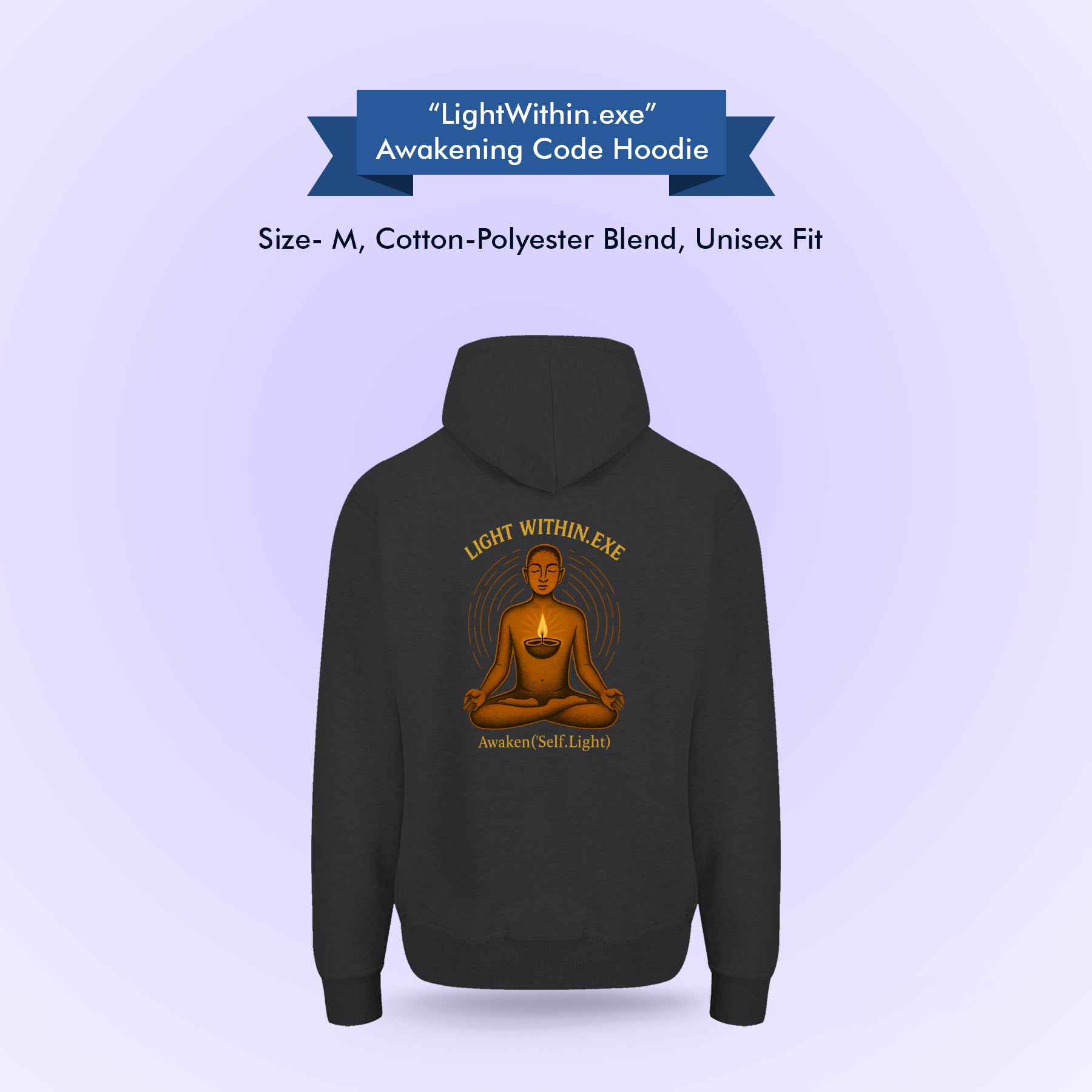 Soft cotton-polyester blend. Back print features a meditating yogi, glowing diya at heart center, and radiant aura lines—symbolizing inner awakening. The phrase LightWithin.exe frames the design with a poetic command-line touch, ending in: Awaken(Self.Light). -